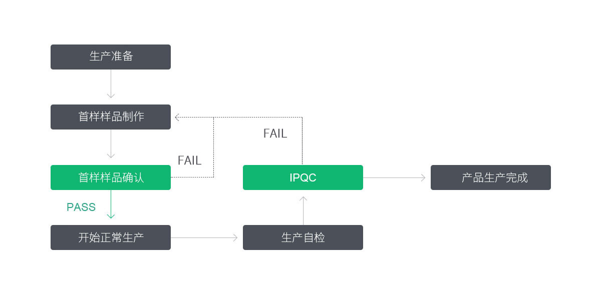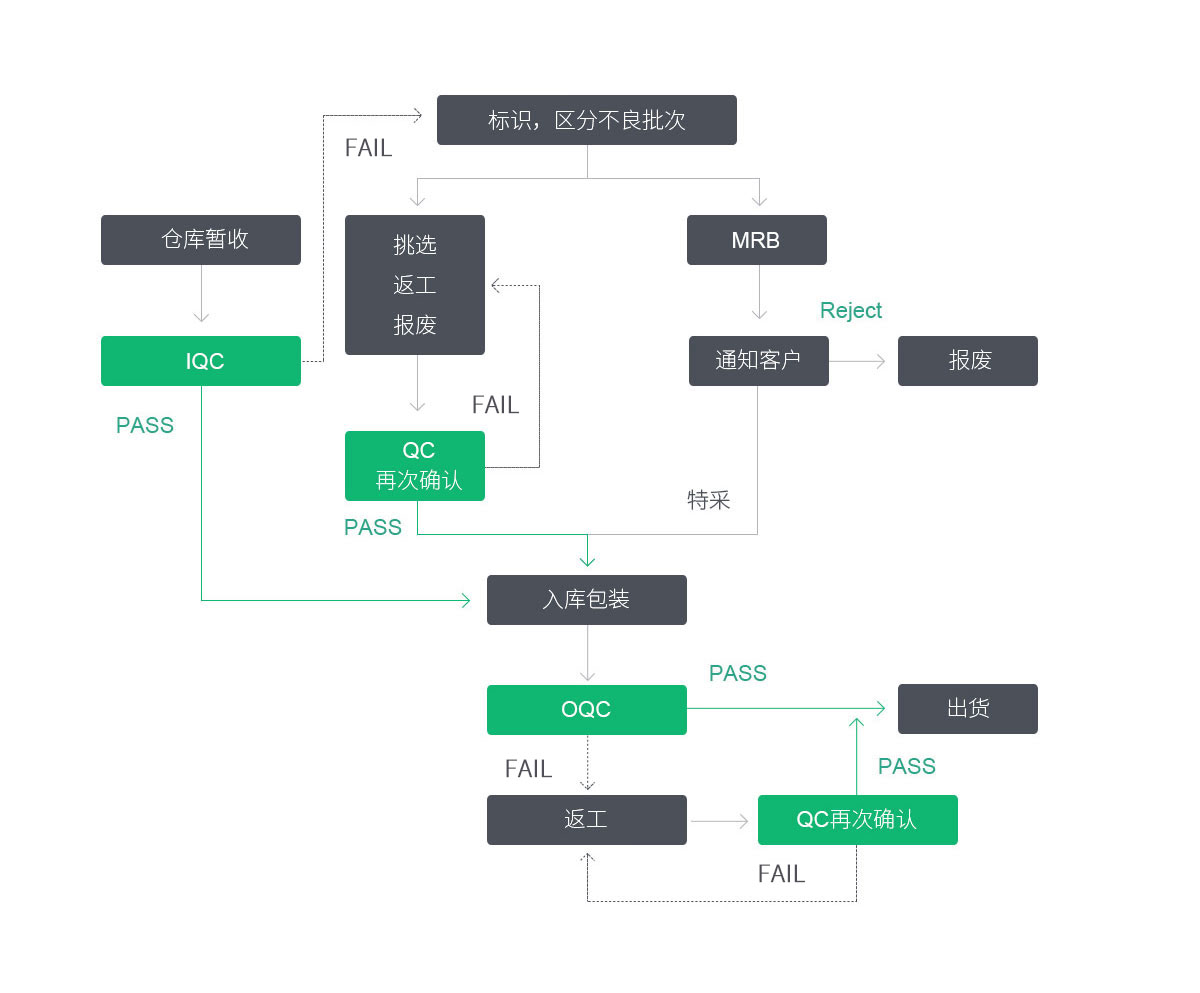 建立健全的質(zhì)量管理(lǐ)制度,針對生産(chǎn)加工(gōng)控制過程建立來料檢驗(IQC),過程檢驗(IPQC),終檢(FQC),出貨檢驗(OQC)四個階段檢驗,全方位控制産(chǎn)品質(zhì)量。嚴格控制原材料質(zhì)量,嚴格執行各工(gōng)序的工(gōng)藝參數,嚴格執行檢驗過程,依據檢驗規範及客戶要求等進行有(yǒu)序管控,确保産(chǎn)品出貨質(zhì)量滿足客戶需求。